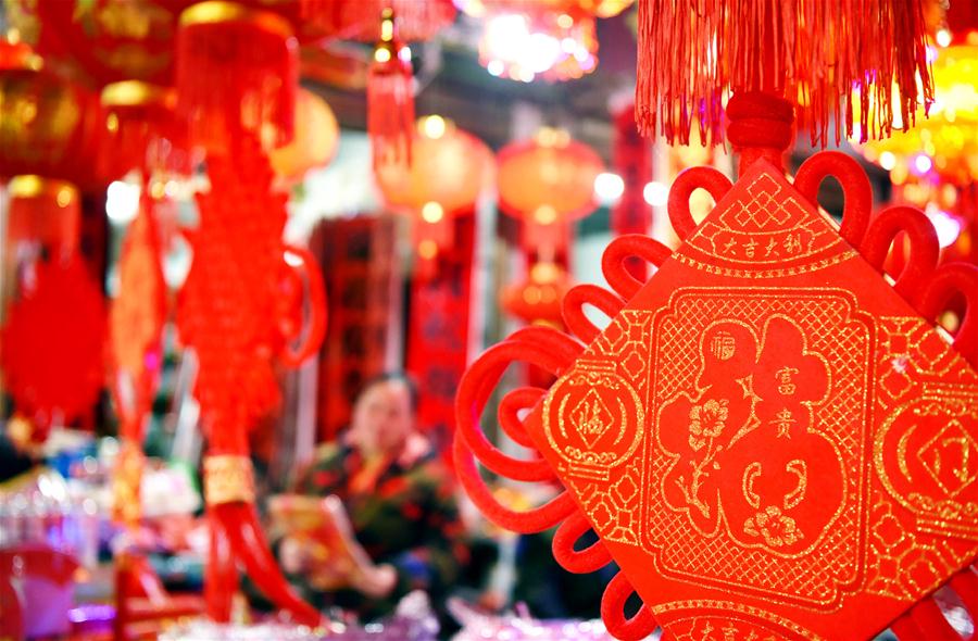 HUNAN, enero 29, 2019 (Xinhua) -- Personas seleccionan decoraciones para el Festival de Primavera en un mercado en el condado Chengbu, en Shaoyang, en la provincia Hunan, en el centro de China, el 29 de enero de 2019. El Festival de Primavera, o el A?o Nuevo Lunar chino, se celebra el 5 de febrero de este a?o. Es una tradición china comprar mercancías, que van de comida hasta electrodomésticos para celebrar el festival. (Xinhua/Yan Qinlong)