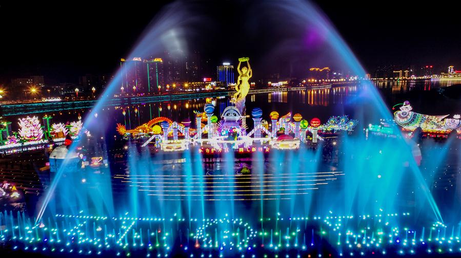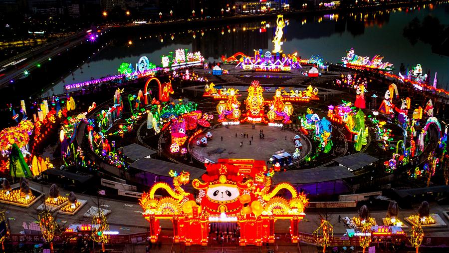 SICHUAN, enero 29, 2019 (Xinhua) -- Imagen del 28 de enero de 2019 de una vista aérea de las linternas de fantasía en el 2 Festival de Linternas de Panda, en la ciudad de Ya'an, provincia de Sichuan, en el suroeste de China. Con luces coloridas y brillantes, el festival de linternas con el tema de panda atrae a muchos turistas. (Xinhua/Gao Huakang)