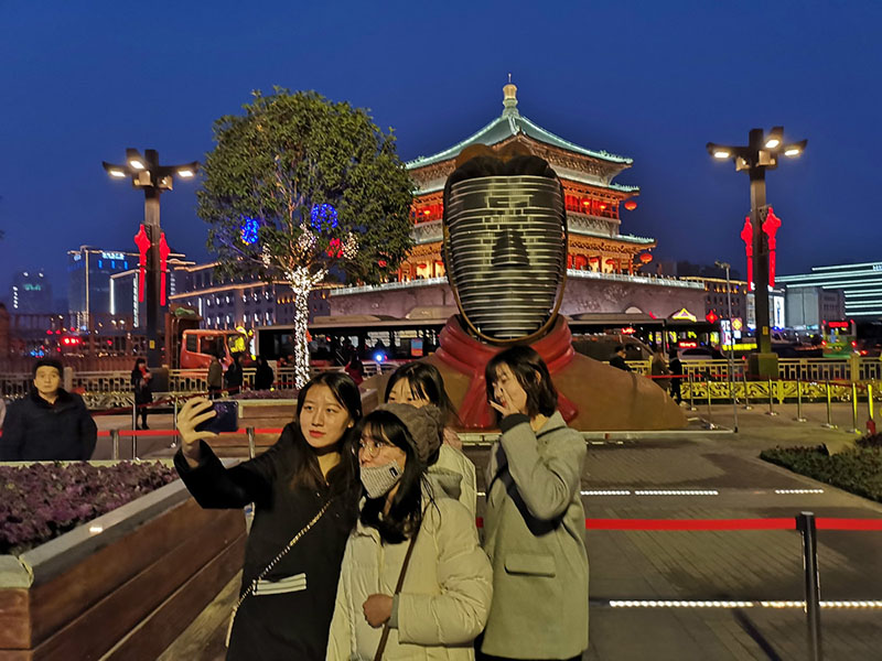 Un busto gigante de un guerrero de terracota estaba ubicado frente a la Torre de la Campana, uno de los lugares más emblemáticos de Xi'an. [Foto: Huo Yan/ Chinadaily. com. cn]