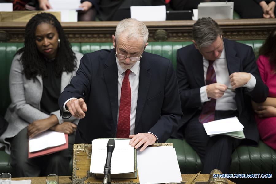 El líder laborista Jeremy Corbyn (frente) asiste a un debate sobre la enmienda del Acuerdo de Brexit en la Cámara de los Comunes, en Londres, Reino Unido, el 29 de enero de 2019. La primera ministra británica, Theresa May, está más cerca que nunca de alcanzar un acuerdo sobre la retirada de Reino Unido de la Unión Europea después de una votación crucial realizada esta noche en la Cámara de los Comunes. (Xinhua/Parlamento de Reino Unido/Jessica Taylor)