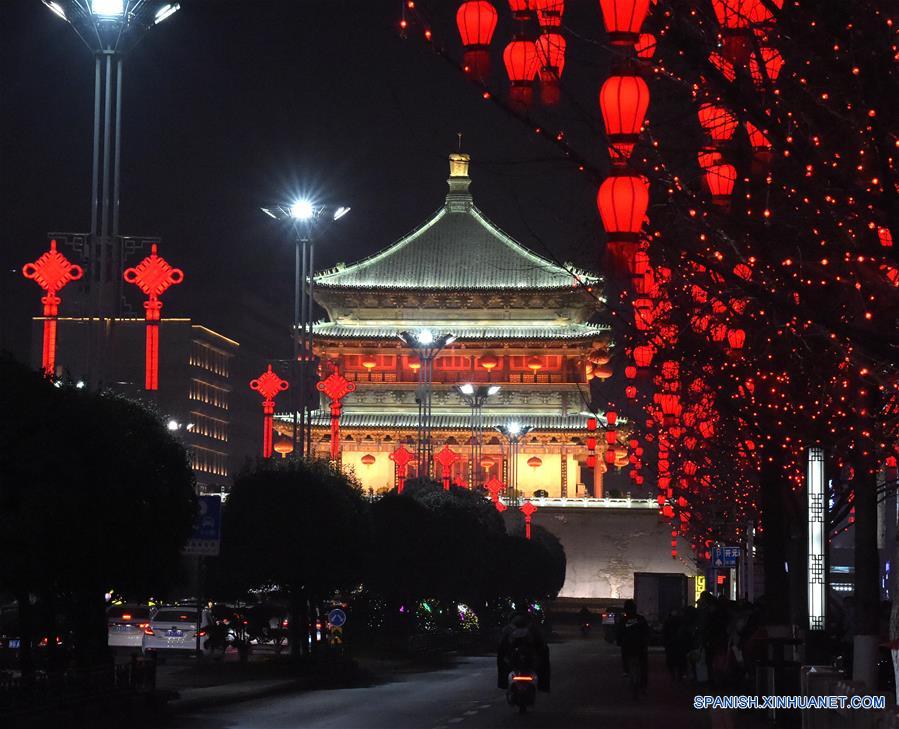 SHAANXI, enero 30, 2019 (Xinhua) -- Imagen del 29 de enero de 2019 de una vista nocturna del Campanario en Xi'an, capital de la provincia de Shaanxi, en el noroeste de China. Xi'an es decorado con hermosas luces en celebración del próximo Festival de Primavera, que se celebra el 5 de febrero este a?o. (Xinhua/Zhang Shuzhong)