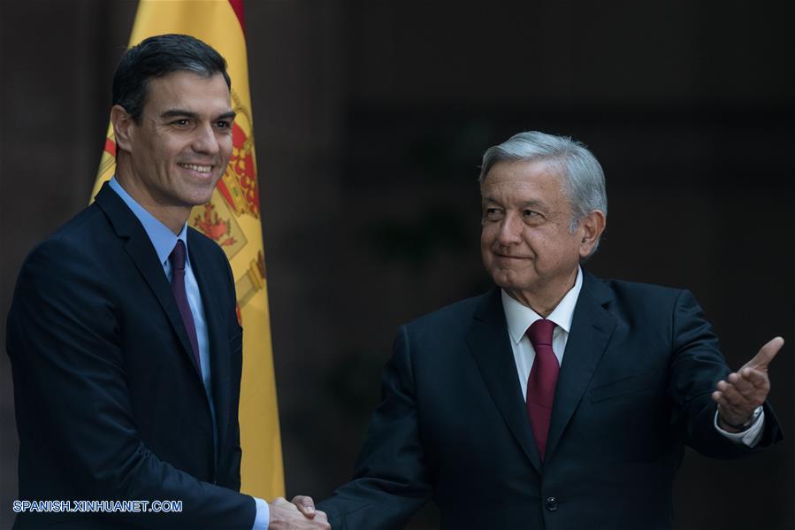 CIUDAD DE MEXICO, enero 30, 2019 (Xinhua) -- El presidente de México, Andrés Manuel López Obrador (d), estrecha la mano con el presidente del Gobierno espa?ol, Pedro Sánchez Pérez-Castejón (i), durante una reunión en Palacio Nacional, en la Ciudad de México, capital de México, el 30 de enero de 2019. De acuerdo con información de la prensa local, la visita del presidente del Gobierno espa?ol, Pedro Sánchez Pérez-Castejón, es la primera que realiza un mandatario extranjero al país desde que Andrés Manuel López Obrador fue nombrado presidente de México. (Xinhua/Francisco Ca?edo)