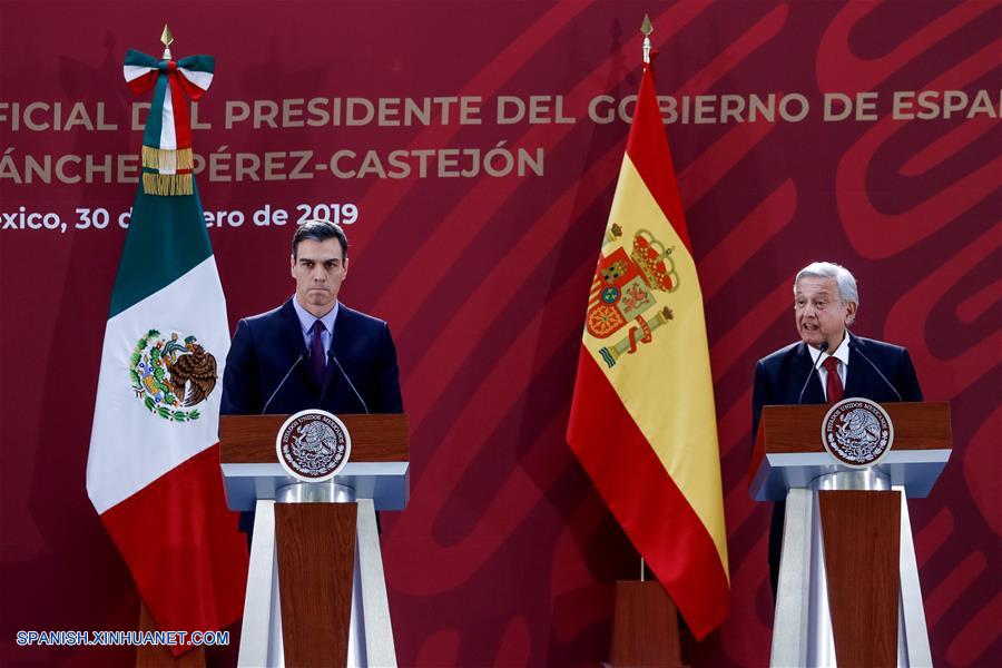 El presidente de México, Andrés Manuel López Obrador (d), y el presidente del Gobierno espa?ol, Pedro Sánchez (i), ofrecen un mensaje a medios, en Palacio Nacional, en la Ciudad de México, capital de México, el 30 de enero de 2019. De acuerdo con información de la prensa local, la visita del presidente del Gobierno espa?ol, Pedro Sánchez, es la primera que realiza un mandatario extranjero al país desde que Andrés Manuel López Obrador fue nombrado presidente de México. (Xinhua/Francisco Ca?edo)
