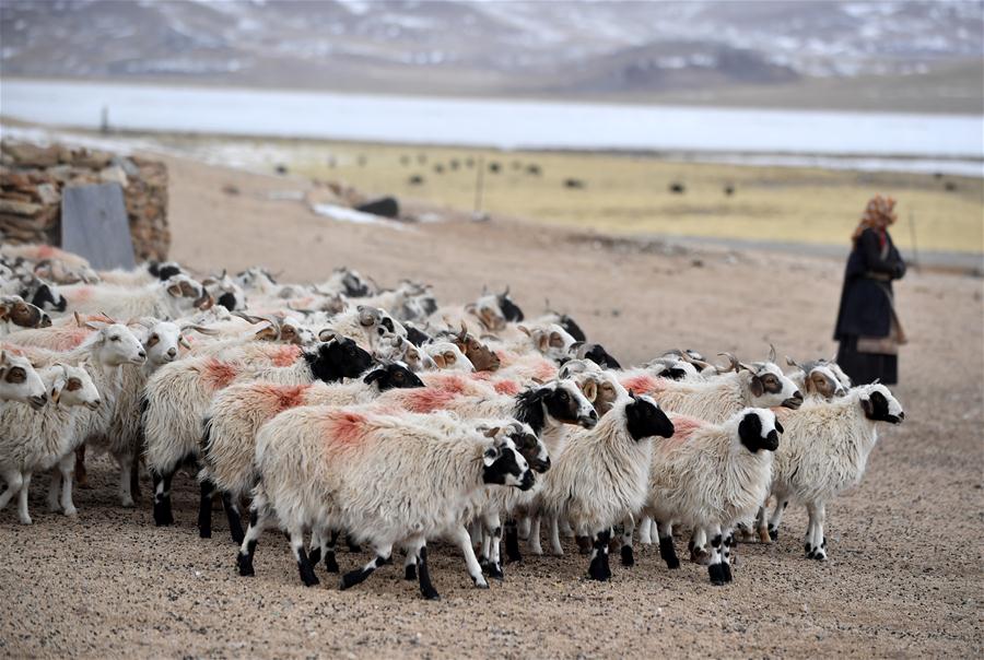 LHASA, enero 31, 2019 (Xinhua) -- Imagen del 17 de enero de 2019 de una pastora conduciendo un reba?o de ovejas en un sitio de reasentamiento de pastores en el condado de Bange, en la Región Autónoma del Tíbet, en el suroeste de China. En el pasado, los pastores en el Tíbet soportaron un largo y frío invierno de octubre a finales de junio, antes de trasladarse a la pradera de verano. No tenían residencia fija y migraron cuando las estaciones cambiaron, llevando sus tiendas de campa?a, utensilios de cocina y otros artículos de primera necesidad a caballo. Hoy en día, la mayoría de los pastores se benefician del programa de reasentamiento. Ellos se despidieron de sus chozas de invierno y se mudaron a casas de estilo tibetano de ladrillo y mortero. (Xinhua/Chogo)