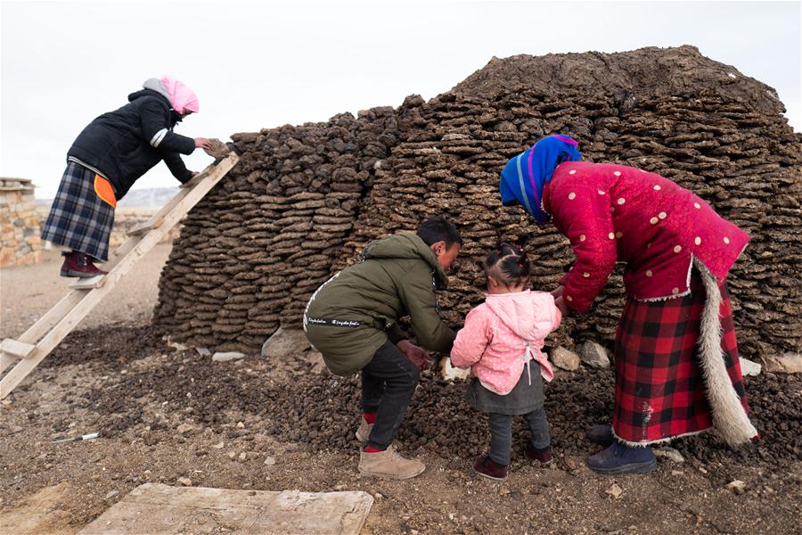 LHASA, enero 31, 2019 (Xinhua) -- Imagen del 17 de enero de 2019 de la pastora Qimei y su familia recolectando estiércol de vaca en un sitio de reasentamiento de pastores en el condado de Bange, en la Región Autónoma del Tíbet, en el suroeste de China. En el pasado, los pastores en el Tíbet soportaron un largo y frío invierno de octubre a finales de junio, antes de trasladarse a la pradera de verano. No tenían residencia fija y migraron cuando las estaciones cambiaron, llevando sus tiendas de campa?a, utensilios de cocina y otros artículos de primera necesidad a caballo. Hoy en día, la mayoría de los pastores se benefician del programa de reasentamiento. Ellos se despidieron de sus chozas de invierno y se mudaron a casas de estilo tibetano de ladrillo y mortero. (Xinhua/Purbu Zhaxi)