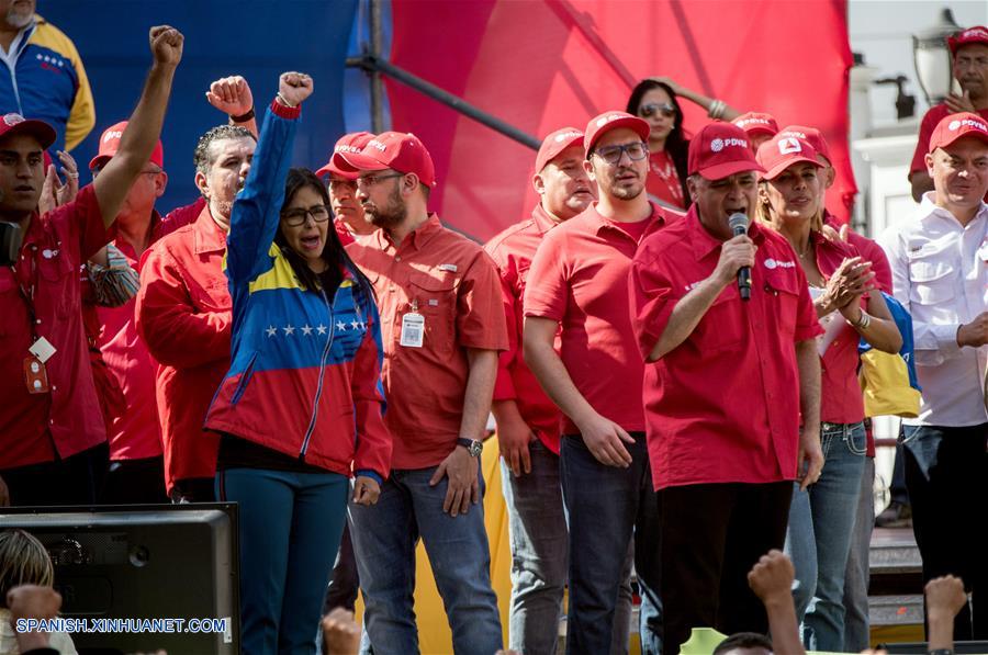 CARACAS, enero 31, 2019 (Xinhua) -- El ministro venezolano para el Petróleo y presidente de Petróleos de Venezuela (PDVSA), Manuel Quevedo (c-d-frente), pronuncia un discurso durante una movilización para respaldar la industria petrolera de Venezuela, frente al Palacio de Miraflores, en Caracas, Venezuela, el 31 de enero de 2019. El ministro venezolano para el Petróleo, Manuel Quevedo, aseguró el jueves que debido a las sanciones que Estados Unidos impuso a la refinería Citgo, filial de Petróleos de Venezuela (PDVSA) en el país norte?o, EEUU deberá pagar por adelantado el petróleo que compren. (Xinhua/Marcos Salgado)