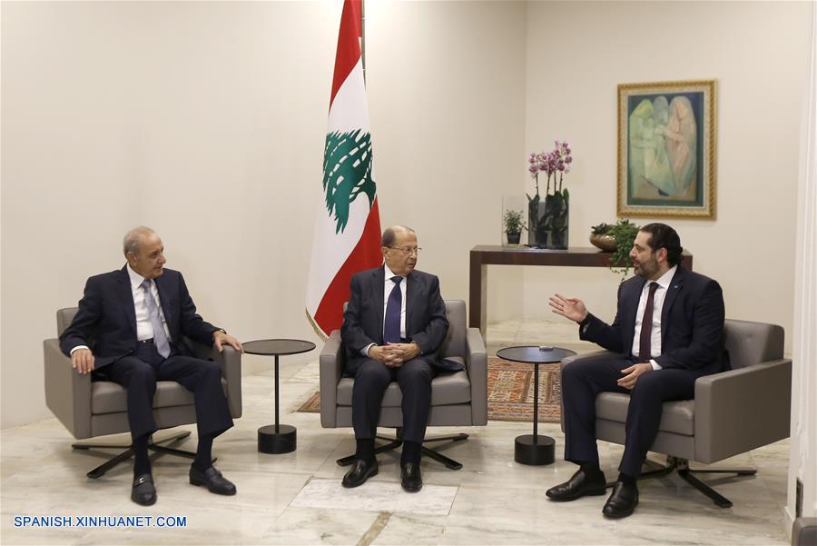 El presidente de Líbano, Michel Aoun (c), se reúne con el primer ministro libanés, Saad Hariri (d), y el presidente del Parlamento libanés, Nabih Berri (i), en Beirut, Líbano, el 31 de enero de 2019. Líbano anunció el jueves la formación de un nuevo gobierno, que es encabezado por el primer ministro Saad Hariri, rompiendo un estancamiento político de casi nueve meses en el país, de acuerdo con el canal de televisión libanés LBCI. (Xinhua/Bilal Jawich)