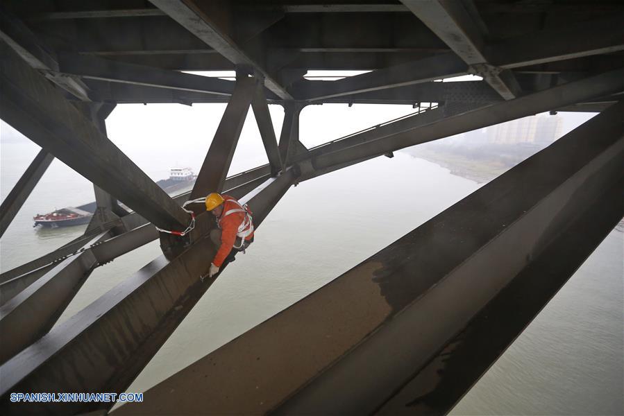 JIUJIANG, febrero 1, 2019 (Xinhua) -- Imagen del 31 de enero de 2019 de un empleado revisando el Puente del Río Yangtze de Jujiang, un puente entramado de carretera de doble piso y una sección importante de la Vía de Tren Beijing-Kowloon (Jingjiu), en Jiujiang, en la provincia de Jiangxi, en el este de China. Las inspecciones de seguridad se han reforzado para asegurar el transporte durante la temporada alta de viajes del Festival de Primavera 2019. (Xinhua/Ding Bo)
