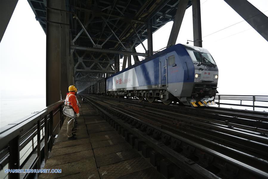 JIUJIANG, febrero 1, 2019 (Xinhua) -- Imagen del 31 de enero de 2019 de empleados esperando que un tren pase en el Puente del Río Yangtze de Jujiang, un puente entramado de carretera de doble piso y una sección importante de la Vía de Tren Beijing-Kowloon (Jingjiu), en Jiujiang, en la provincia de Jiangxi, en el este de China. Las inspecciones de seguridad se han reforzado para asegurar el transporte durante la temporada alta de viajes del Festival de Primavera 2019. (Xinhua/Ding Bo)