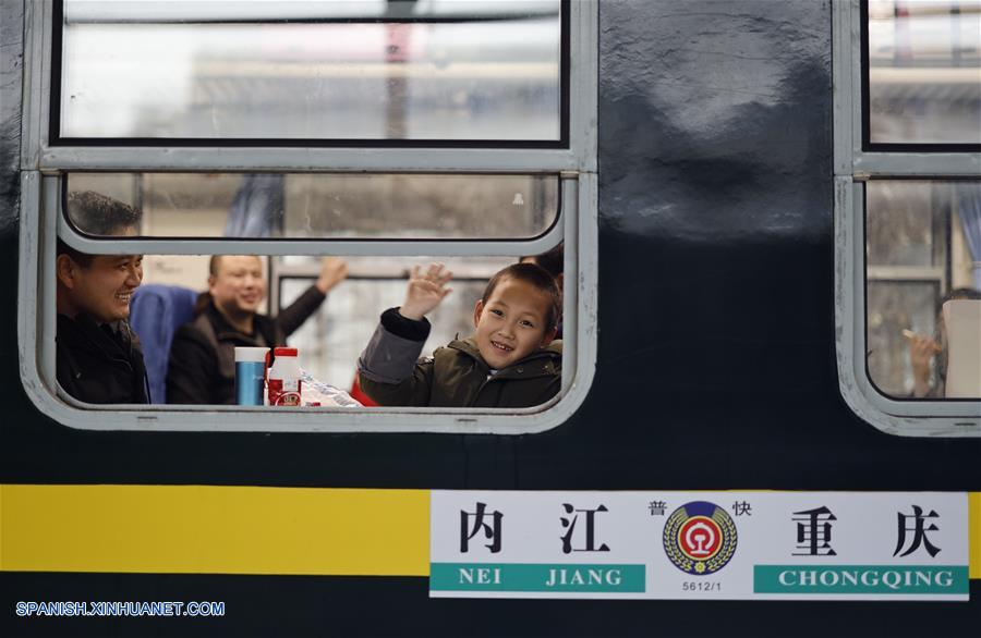 CHONGQING, febrero 1, 2019 (Xinhua) -- Imagen del 31 de enero de 2019 de un peque?o pasajero saludando a bordo de un tren verde de baja velocidad que corre de la municipalidad de Chongqing, en el suroeste de China a la ciudad de Neijiang, de la provincia de Sichuan, en el suroeste de China. Los trenes verdes de baja velocidad todavía están en funcionamiento mientras los trenes bala corren por nuevas estaciones a través de China. Los antiguos trenes verdes son una alternativa de bajo costo para que las personas viajen durante la temporada alta de viajes del Festival de Primavera. (Xinhua/Liu Chan)