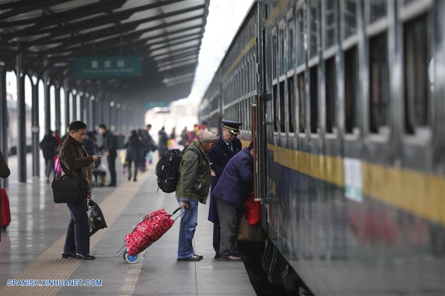 CHONGQING, febrero 1, 2019 (Xinhua) -- Imagen del 31 de enero de 2019 de pasajeros abordando un tren verde de baja velocidad en la Estación del Ferrocarril de Chongqing, en Chongqing, en el suroeste de China. Los trenes verdes de baja velocidad todavía están en funcionamiento mientras los trenes bala corren por nuevas estaciones a través de China. Los antiguos trenes verdes son una alternativa de bajo costo para que las personas viajen durante la temporada alta de viajes del Festival de Primavera. (Xinhua/Liu Chan)