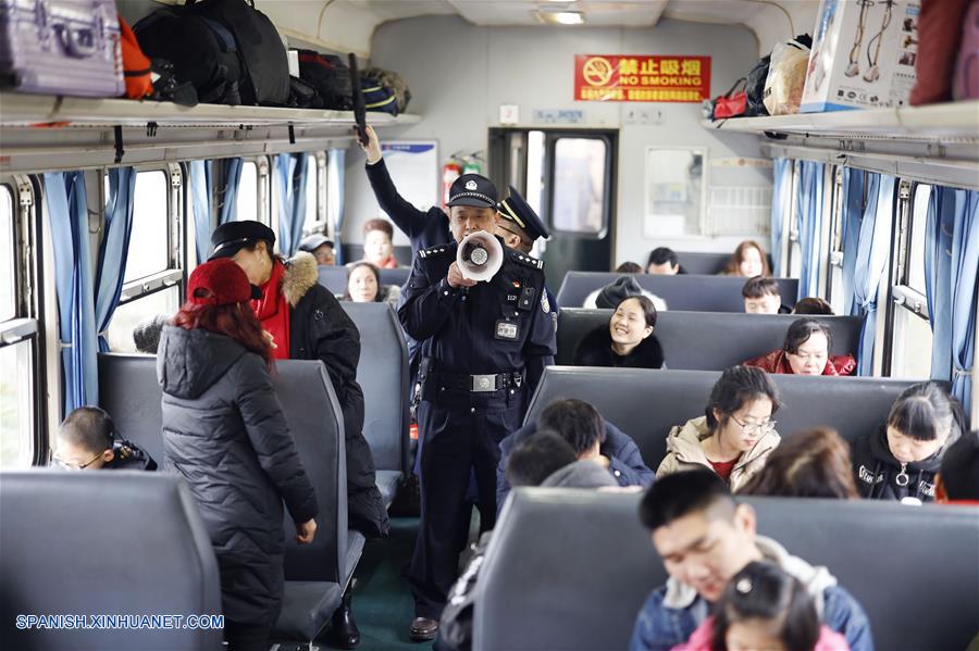 CHONGQING, febrero 1, 2019 (Xinhua) -- Imagen del 31 de enero de 2019 de un policía ferroviario advirtiendo a los pasajeros acerca de las reglas de seguridad de viaje a bordo de un tren verde de baja velocidad que corre de la municipalidad de Chongqing, en el suroeste de China a la ciudad de Neijiang, de la provincia de Sichuan, en el suroeste de China. Los trenes verdes de baja velocidad todavía están en funcionamiento mientras los trenes bala corren por nuevas estaciones a través de China. Los antiguos trenes verdes son una alternativa de bajo costo para que las personas viajen durante la temporada alta de viajes del Festival de Primavera. (Xinhua/Liu Chan)