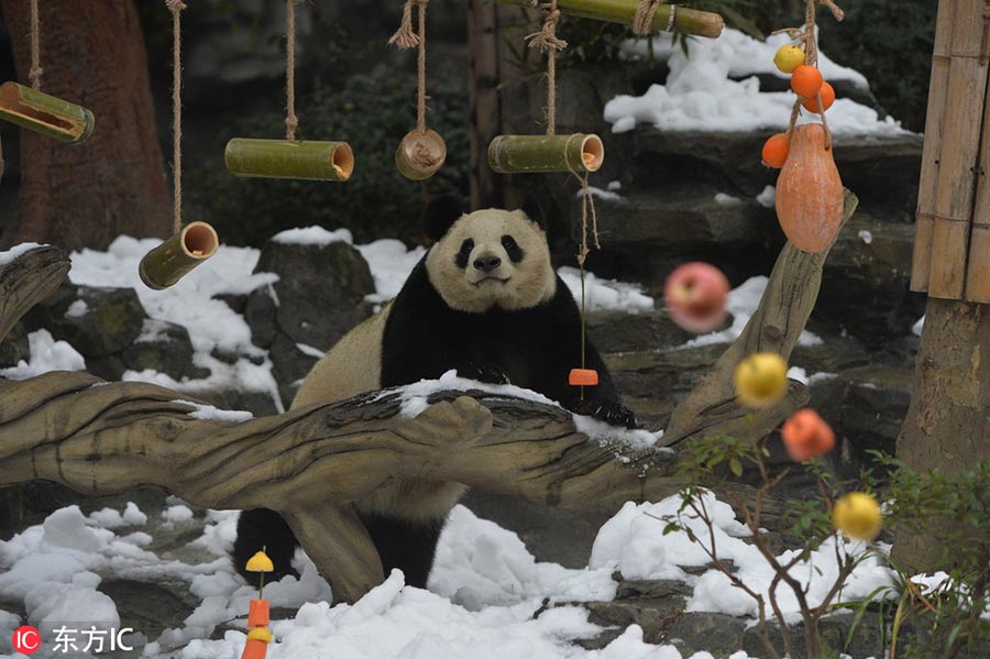 Con el fin de despertar su interés ante un nuevo entorno y estimular su dinamismo, la Base de Investigación para la Cría del Panda Gigante en Chengdu seguirá trayendo nieve para el trío de pandas.