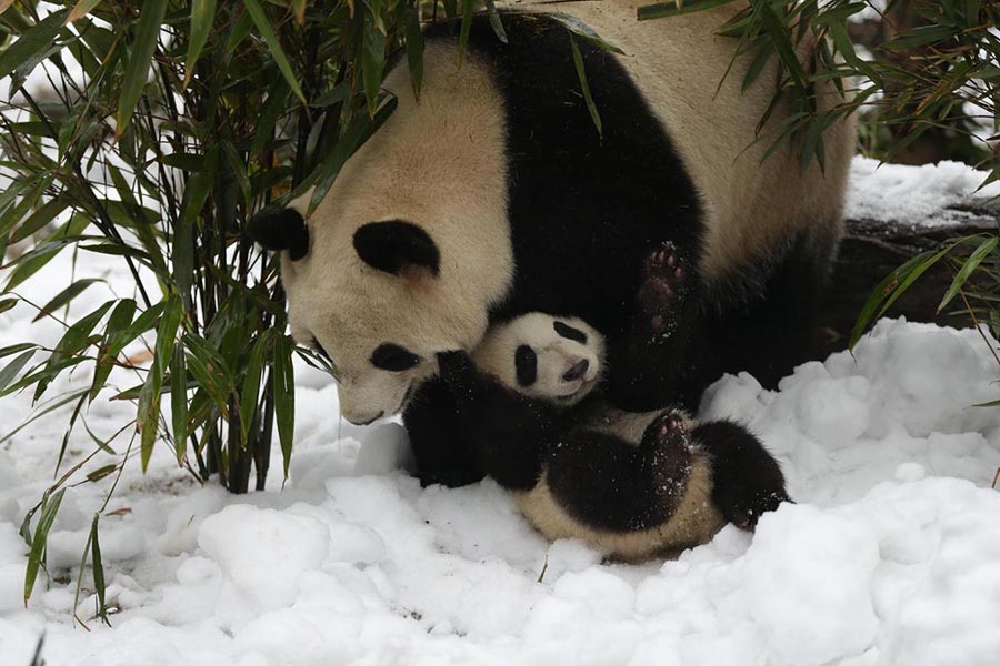 Junto a uno de sus cachorros, Ai Li disfruta de la nieve traída desde el Tibet hasta la Base de Investigación para la Cría del Panda Gigante en Chengdu, provincia de Sichuan. [Foto: proporcionada a chinadaily.com.cn]