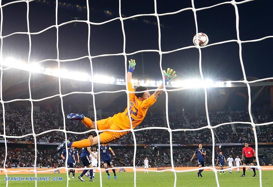 ABU DHABI, febrero 1, 2019 (Xinhua) -- El guardameta Shuichi Gonda, de Japón, recibe una anotación durante el partido de la final de la Copa Asiática 2019 de la Confederación Asiática de Fútbol (AFC, por sus siglas en inglés), ante Qatar, en Abu Dhabi, Emiratos Arabes Unidos (EAU), el 1 de febrero de 2019. (Xinhua/Cao Can)