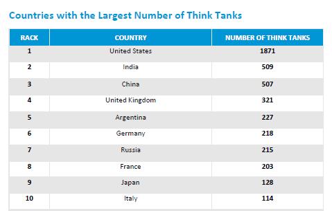 Beijing, 02/02/2019(El Pueblo en Línea) - China tiene el tercer número de “think-tanks” del mundo, con un total de 507, seguidos por los Estados Unidos y la India, que tienen 1.871 y 509, respectivamente, asegura el último informe global del índice Penn, elaborado por la Universidad de Pennsylvania.