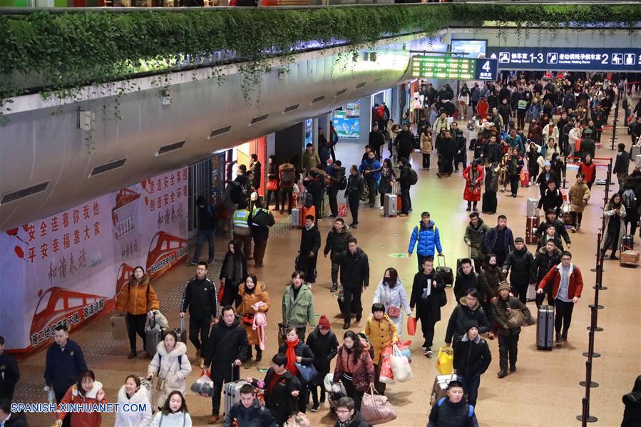 BEIJING, febrero 1, 2019 (Xinhua) -- Pasajeros caminan para abordar trenes en la Estación de Trenes del Oeste de Beijing, en Beijing, capital de China, el 1 de febrero de 2019. La empresa China Railway Beijing Group Co., Ltd. esperaba transportar 1.03 millones de pasajeros el viernes. El ferrocarril de Beijing fue testigo de un aumento en los viajes, cuando la gente comenzó a emprender viajes para el A?o Nuevo Lunar, que se celebra el 5 de febrero de 2019. (Xinhua/Xing Guangli)