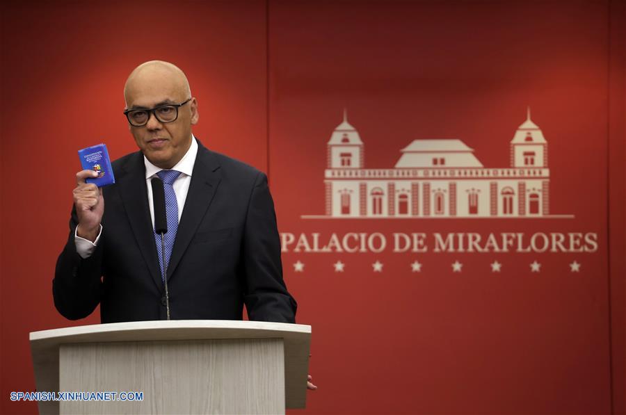 CARACAS, febrero 7, 2019 (Xinhua) -- El ministro venezolano de Comunicación e Información, Jorge Rodríguez, participa en una conferencia de prensa en Caracas, capital de Venezuela, el 7 de febrero de 2019. El ministro venezolano Jorge Rodríguez presentó el jueves ante medios parte del testimonio del coronel retirado, Oswaldo García Palomo, quien recientemente fue detenido acusado de participar en planes para derrocar al gobierno del presidente Nicolás Maduro. (Xinhua/Mauricio Valenzuela)