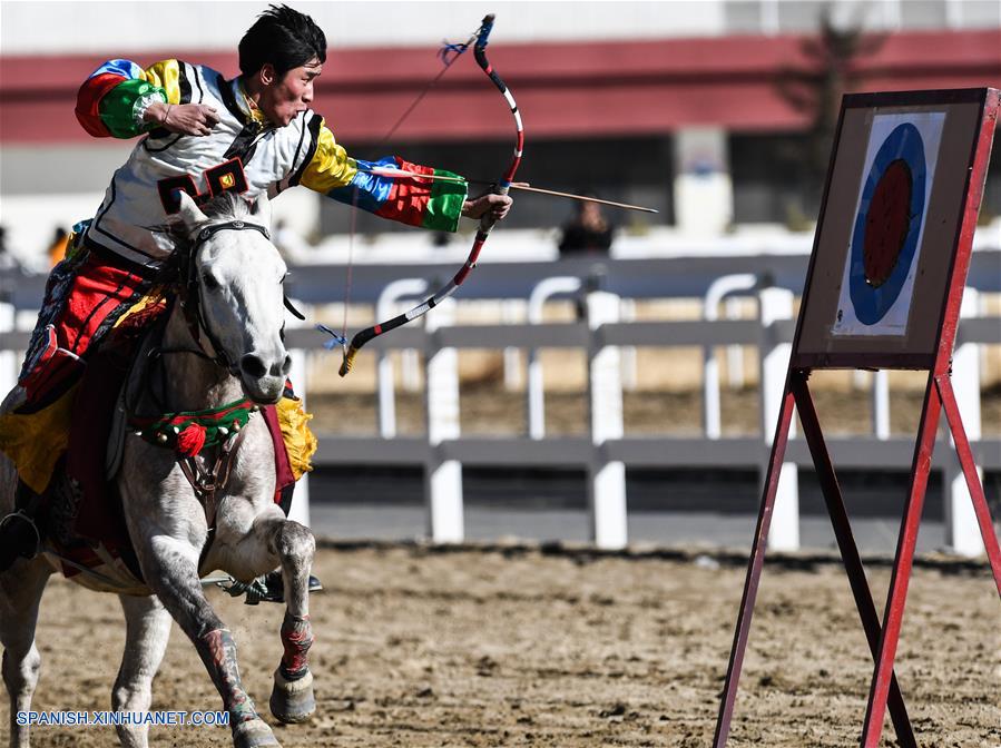 LHASA, febrero 7, 2019 (Xinhua) -- Un hombre demuestra sus habilidades ecuestres durante un evento llevado a cabo para celebrar el A?o Nuevo tibetano, en Lhasa, capital de la Región Autónoma del Tíbet, en el suroeste de China, el 7 de febrero de 2019. (Xinhua/Purbu Zhaxi)