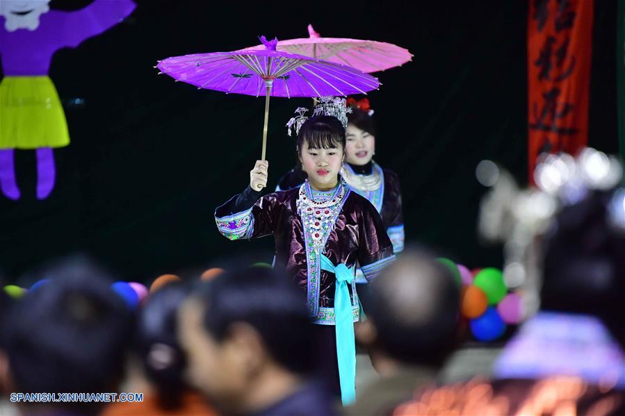 GUANGXI, febrero 7, 2019 (Xinhua) -- Imagen del 6 de febrero de 2019 de personas del grupo étnico Miao realizando una actuación durante una reunión del Festival de Primavera llevada a cabo en el segundo día del A?o Nuevo Lunar chino, en la villa de Yaogao del municipio de Gandong en el Condado Autónomo Miao de Rongshui, en la Región Autónoma Zhuang de Guangxi, en el sur de China. (Xinhua/Huang Xiaobang)