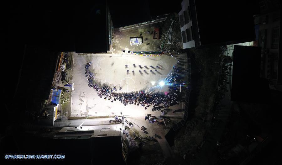 GUANGXI, febrero 7, 2019 (Xinhua) -- Imagen del 6 de febrero de 2019 de una vista aérea de una reunión del Festival de Primavera llevada a cabo en el segundo día del A?o Nuevo Lunar chino, en la villa de Yaogao del municipio de Gandong en el Condado Autónomo Miao de Rongshui, en la Región Autónoma Zhuang de Guangxi, en el sur de China. (Xinhua/Huang Xiaobang)