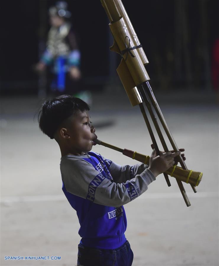 GUANGXI, febrero 7, 2019 (Xinhua) -- Imagen del 6 de febrero de 2019 de un ni?o tocando el "Lu Sheng", un instrumento de viento de tubo de ca?a, junto al escenario de una reunión del Festival de Primavera llevada a cabo en el segundo día del A?o Nuevo Lunar chino, en la villa de Yaogao del municipio de Gandong en el Condado Autónomo Miao de Rongshui, en la Región Autónoma Zhuang de Guangxi, en el sur de China. (Xinhua/Huang Xiaobang)