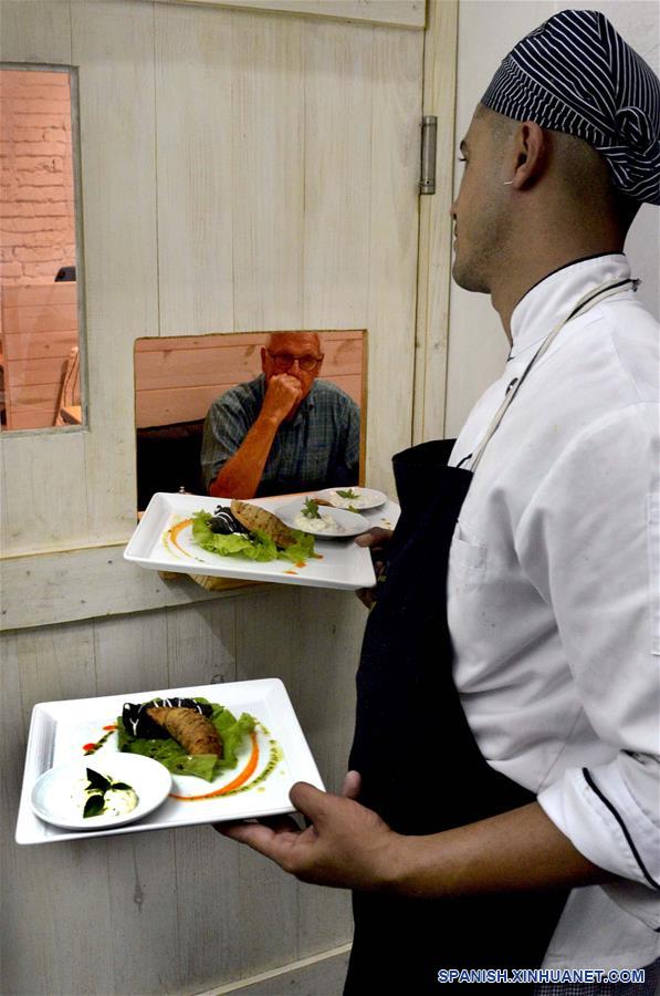 Imagen del 2 de febrero de 2019 de un cocinero sosteniendo dos platos de tapas o montaditos, en el restaurante "Café Vintage", ubicado en el municipio Plaza de la Revolución, en La Habana, capital de Cuba. Un grupo de jóvenes emprendedores de La Habana promueve por estos días un concurso singular, con una versión muy cubana, novedosa y tropical de las típicas rutas de tapas que se realizan en Espa?a. (Xinhua/Joaquín Hernández)