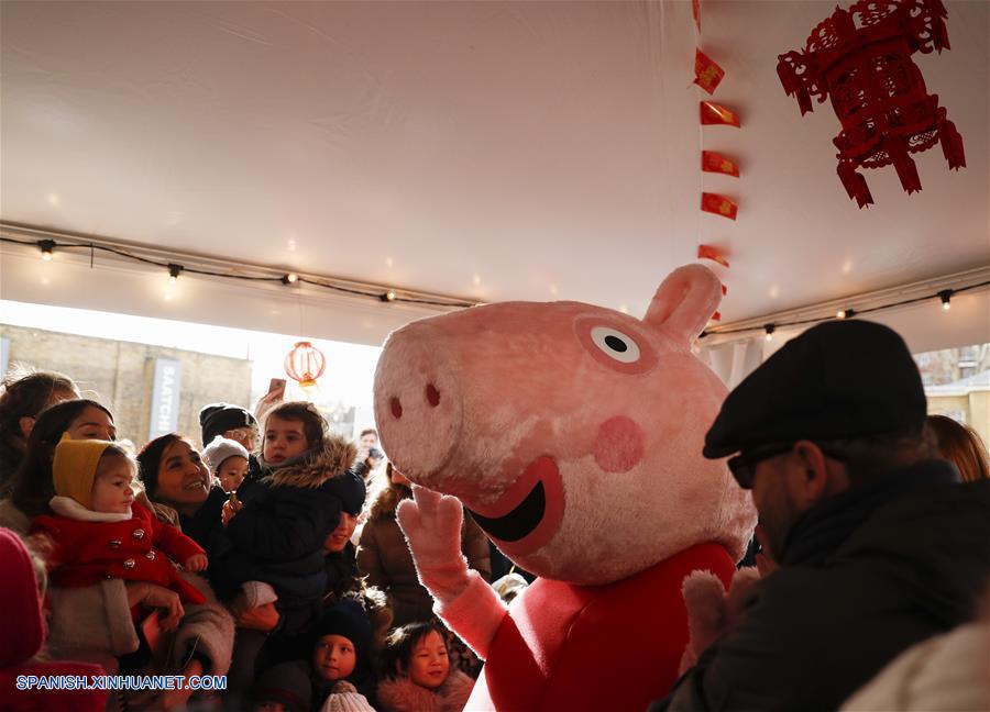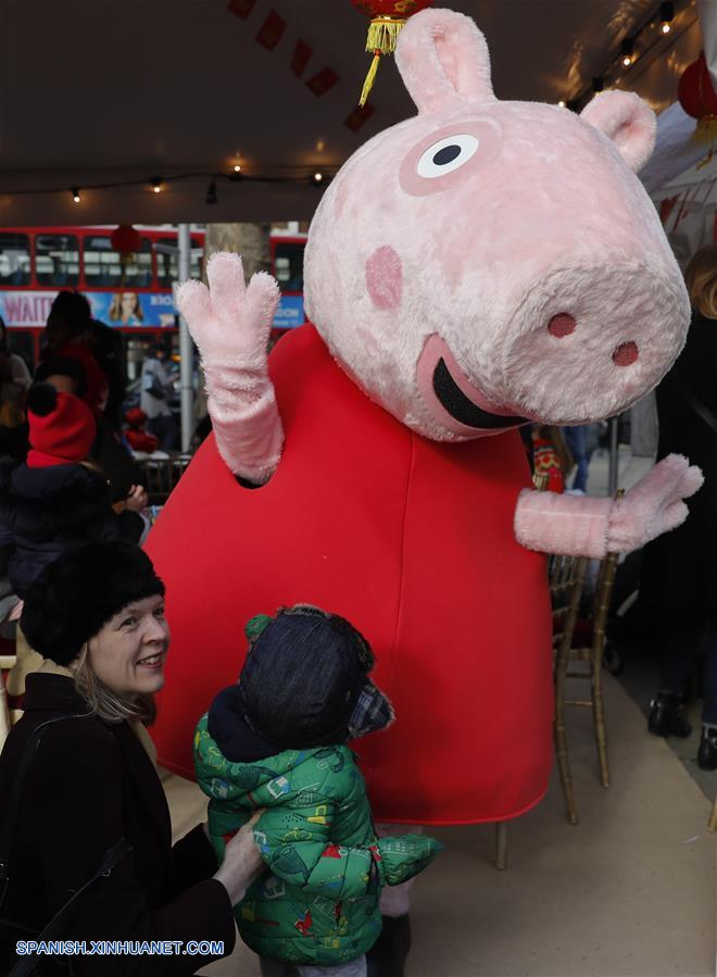 LONDRES, febrero 9, 2019 (Xinhua) -- Un actor disfrazado del personaje Peppa Pig es recibido por ni?os durante una celebración del A?o Nuevo Lunar chino en la Plaza del Duque de York, en Londres, Reino Unido, el 9 de febrero de 2019. (Xinhua/Han Yan)