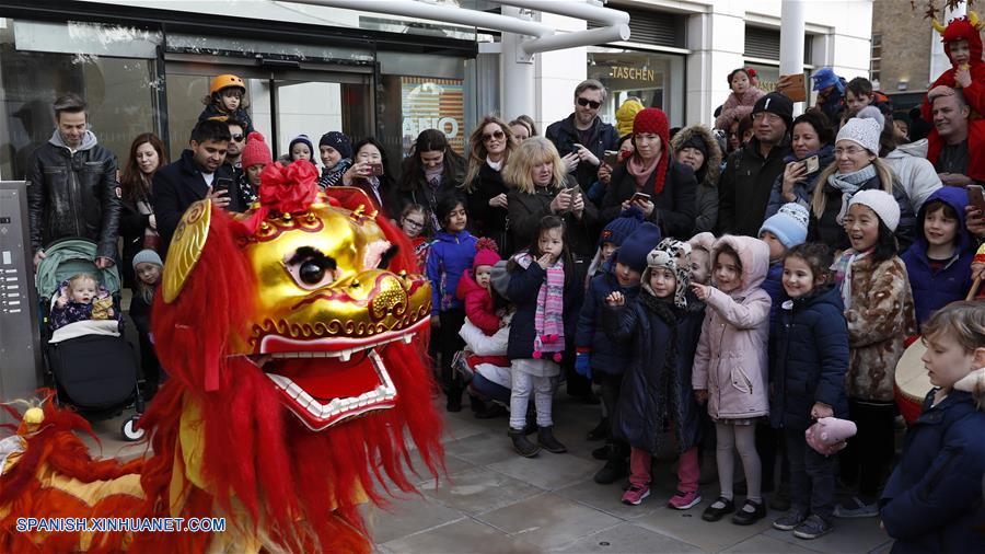 LONDRES, febrero 9, 2019 (Xinhua) -- Personas observan un espectáculo de la danza del león durante una celebración del A?o Nuevo Lunar chino en la Plaza del Duque de York, en Londres, Reino Unido, el 9 de febrero de 2019. (Xinhua/Han Yan)