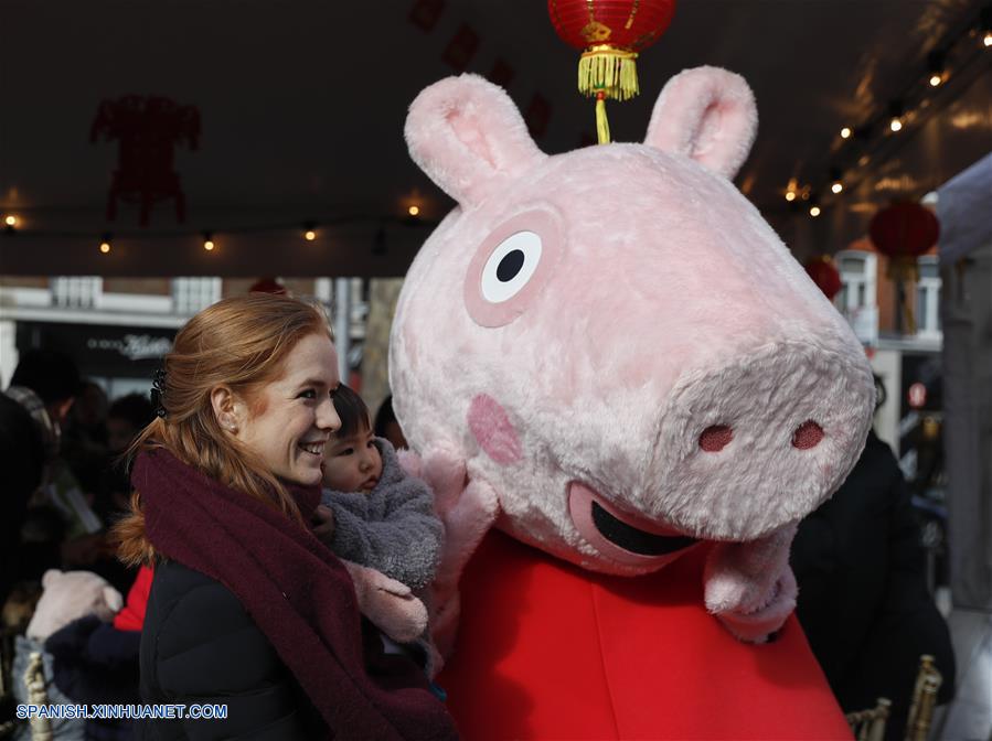 LONDRES, febrero 9, 2019 (Xinhua) -- Un actor disfrazado del personaje Peppa Pig posa durante una celebración del A?o Nuevo Lunar chino en la Plaza del Duque de York, en Londres, Reino Unido, el 9 de febrero de 2019. (Xinhua/Han Yan)