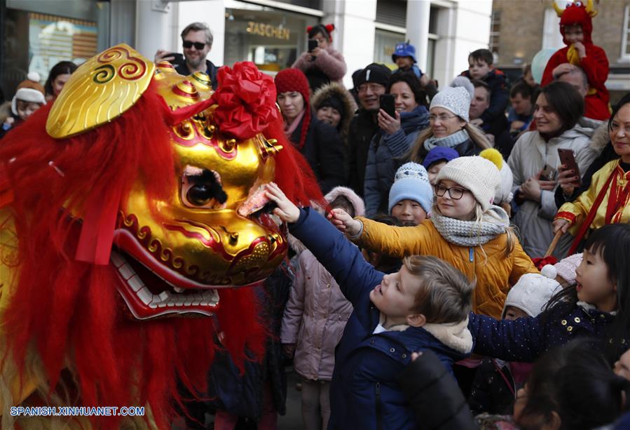 LONDRES, febrero 9, 2019 (Xinhua) -- Ni?os tocan partes de un traje usado en un espectáculo de la danza del león durante una celebración del A?o Nuevo Lunar chino en la Plaza del Duque de York, en Londres, Reino Unido, el 9 de febrero de 2019. (Xinhua/Han Yan)