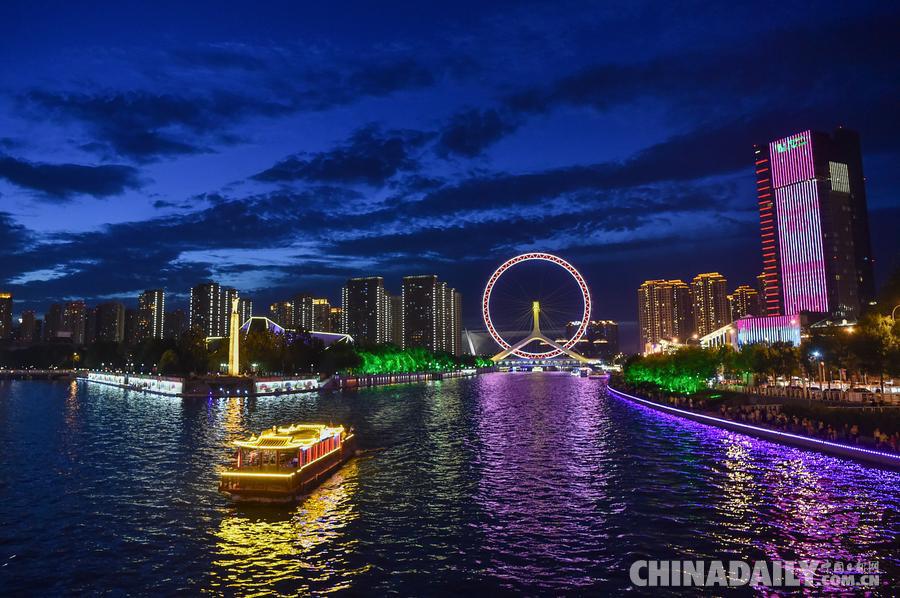 La vista noctorna del Ojo de Tianjin, una noria gigante, junto al río Haihe el 25 de agosto de 2017. [Foto / China Daily]