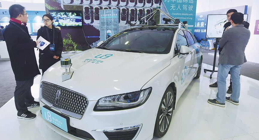 Un automóvil autónomo con tecnología 5G llama la atención de los visitantes en el Parque de Innovación 5G de China (Hangzhou) en la provincia de Zhejiang. [Foto por Long Wei / China Daily]