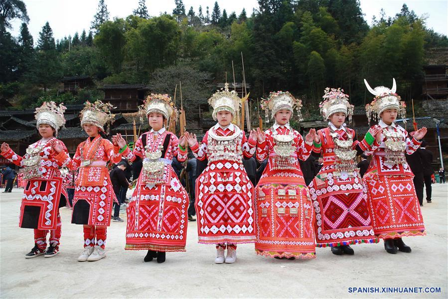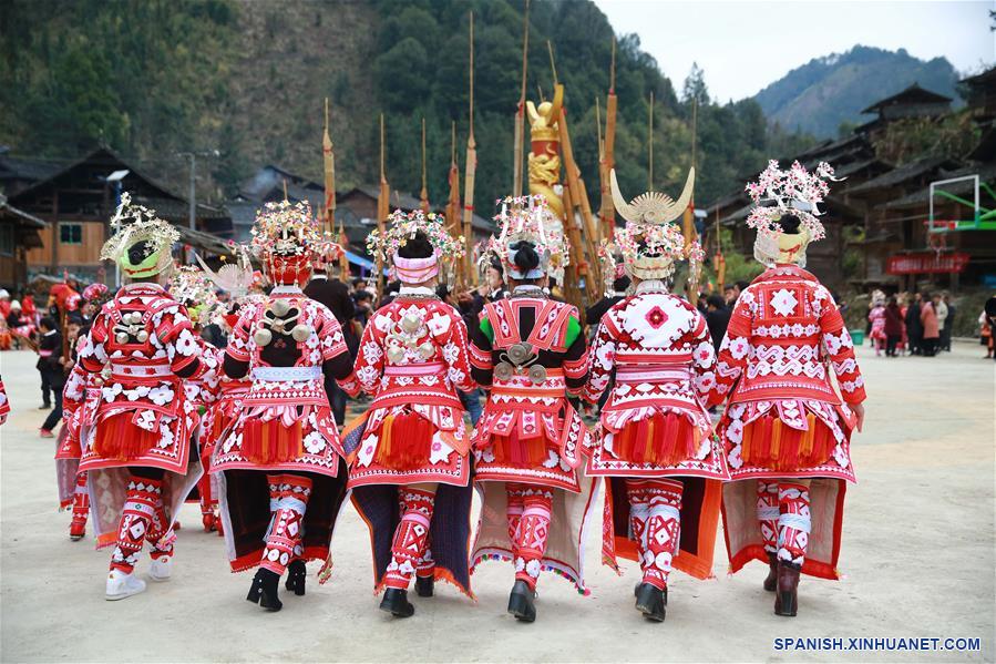 GUIZHOU, febrero 11, 2019 (Xinhua) -- Personas del grupo étnico Miao, realizan una danza lusheng, durante el séptimo día del A?o Nuevo Lunar chino, en la villa Cenzui del municipio de Langdong en el condado de Rongjiang, en la provincia de Guizhou, en el suroeste de China, el 11 de febrero de 2019. Los residentes invitaron el lunes a los equipos de danza lusheng de las villas vecinas para celebrar juntos la Fiesta de Primavera, o A?o Nuevo Lunar chino. (Xinhua/Yang Chengli)