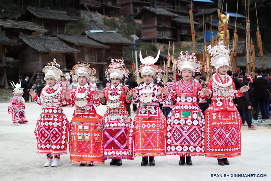 GUIZHOU, febrero 11, 2019 (Xinhua) -- Personas del grupo étnico Miao, tocan el lusheng, un instrumento de viento hecho con tubos de ca?a, durante el séptimo día del A?o Nuevo Lunar chino, en la villa Cenzui del municipio de Langdong en el condado de Rongjiang, en la provincia de Guizhou, en el suroeste de China, el 11 de febrero de 2019. Los residentes invitaron el lunes a los equipos de danza lusheng de las villas vecinas para celebrar juntos la Fiesta de Primavera, o A?o Nuevo Lunar chino. (Xinhua/Li Changhua)
