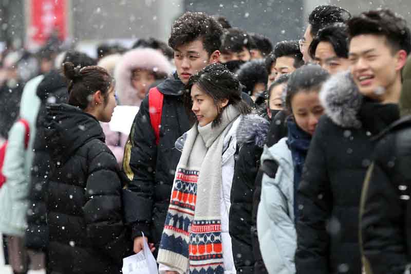 Beijing, 13/02/2019(El Pueblo en Línea) - Los estudiantes hacen fila para someterse a un examen de admisión en la Academia Central de Drama en Beijing el 12 de febrero de 2019, día en el que cayó la primera gran nevada del a?o. [Foto por Wang Zhuangfei / chinadaily.com.cn]