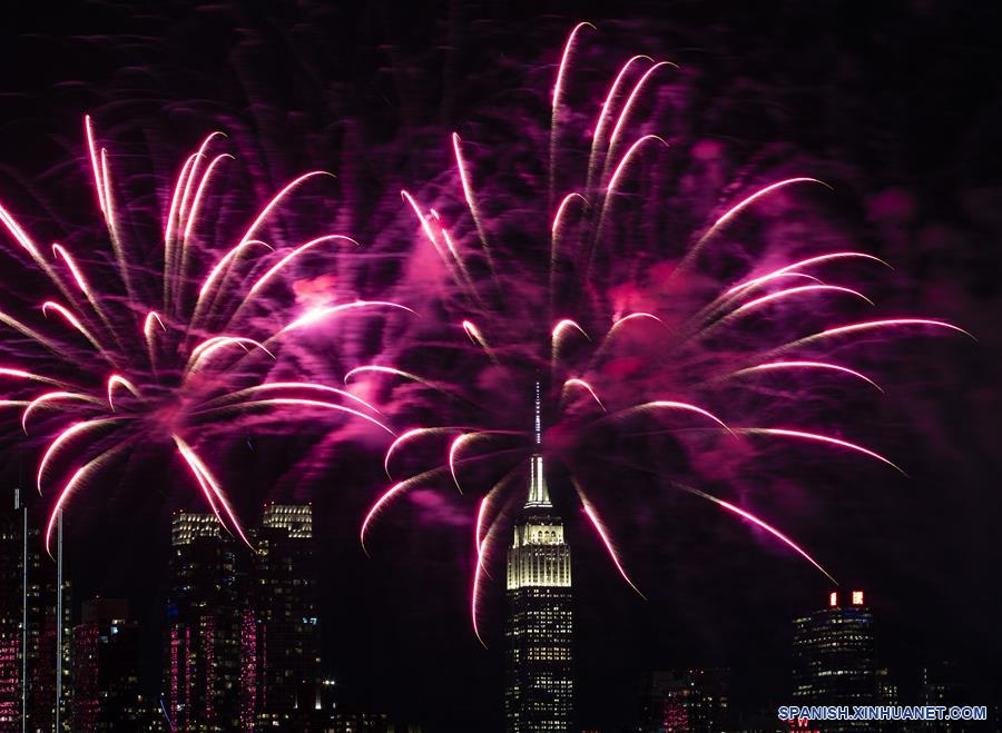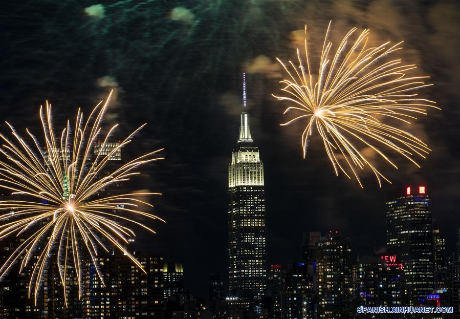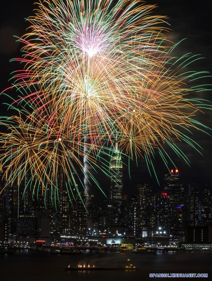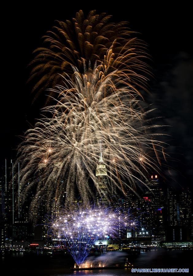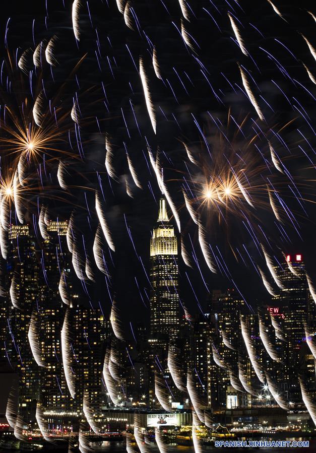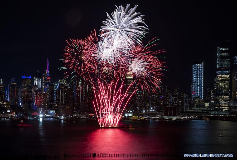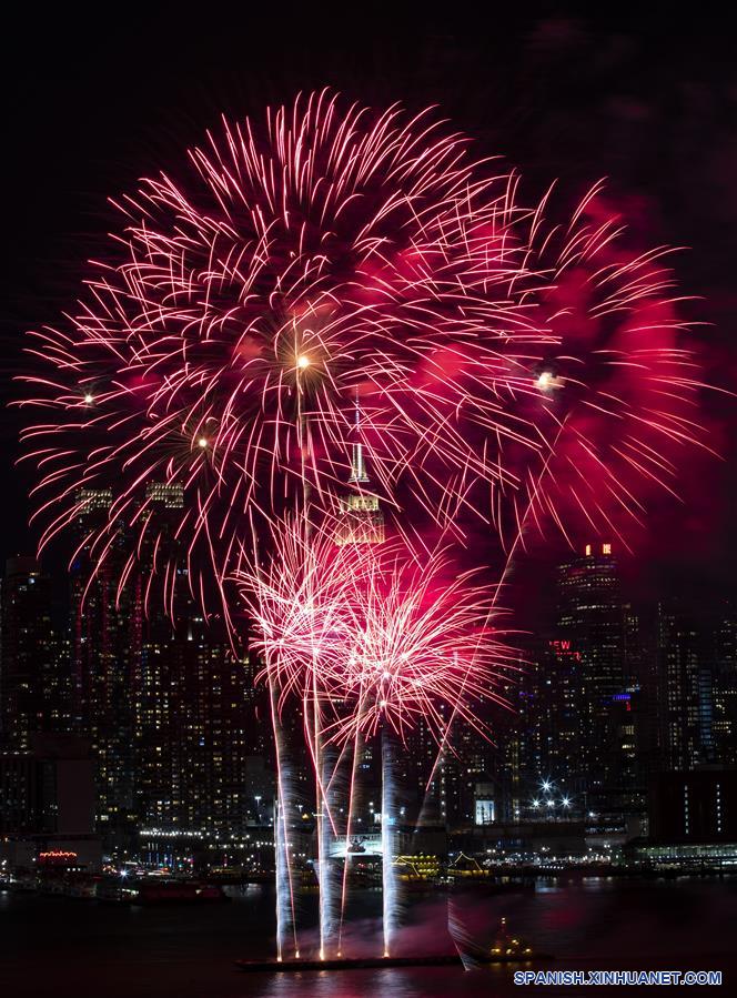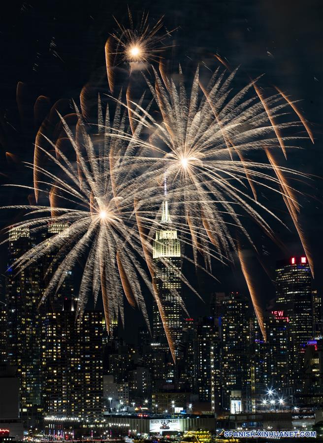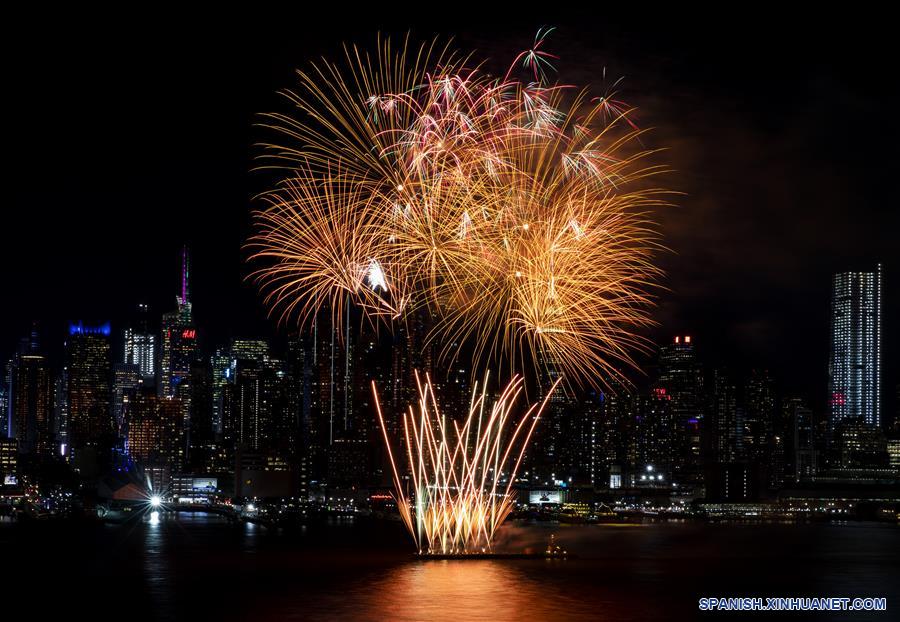 NUEVA YORK, febrero 12, 2019 (Xinhua) -- Imagen del 11 de febrero de 2019 de fuegos artificiales estallando sobre el Río Hudson para celebrar el A?o Nuevo Lunar chino, en Nueva York, Estados Unidos. (Xinhua/Wang Ying)