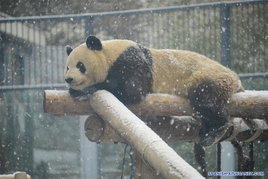 BEIJING, febrero 12, 2019 (Xinhua) -- Un panda gigante descansa bajo una nevada en el Zoológico de Beijing, en Beijing, capital de China, el 12 de febrero de 2019. Una nevada afectó el martes a Beijing. (Xinhua/Fan Jiashan)