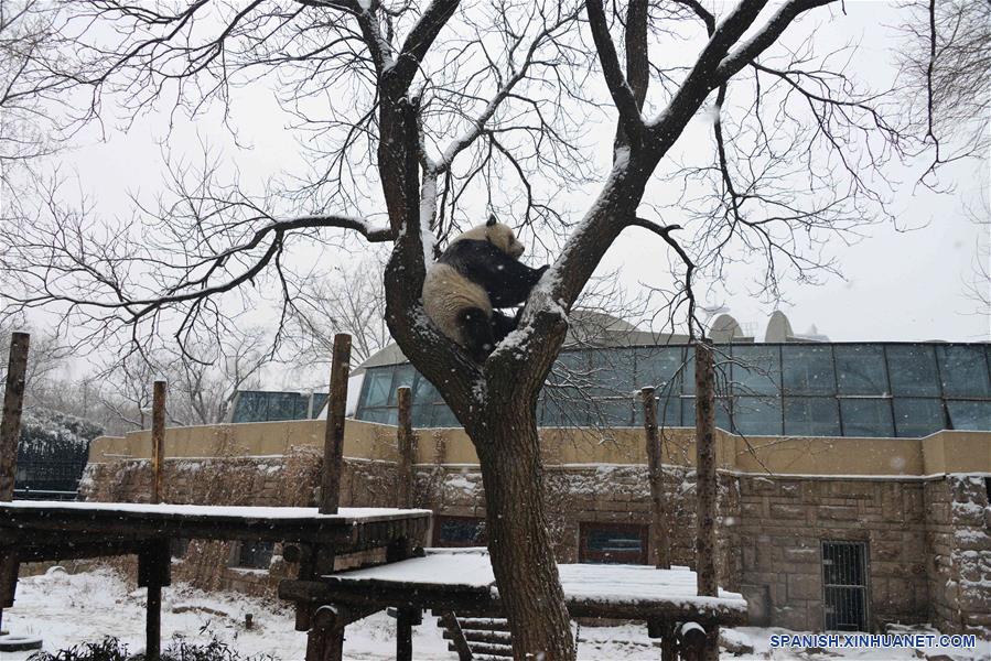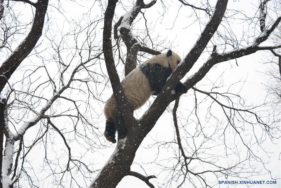 BEIJING, febrero 12, 2019 (Xinhua) -- Un panda gigante escala un árbol bajo una nevada en el Zoológico de Beijing, en Beijing, capital de China, el 12 de febrero de 2019. Una nevada afectó el martes a Beijing. (Xinhua/Fan Jiashan)