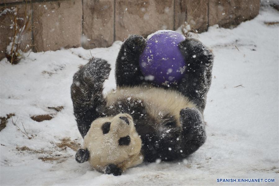BEIJING, febrero 12, 2019 (Xinhua) -- Un panda juega con una pelota bajo una nevada en el Zoológico de Beijing, en Beijing, capital de China, el 12 de febrero de 2019. Una nevada afectó el martes a Beijing. (Xinhua/Fan Jiashan)