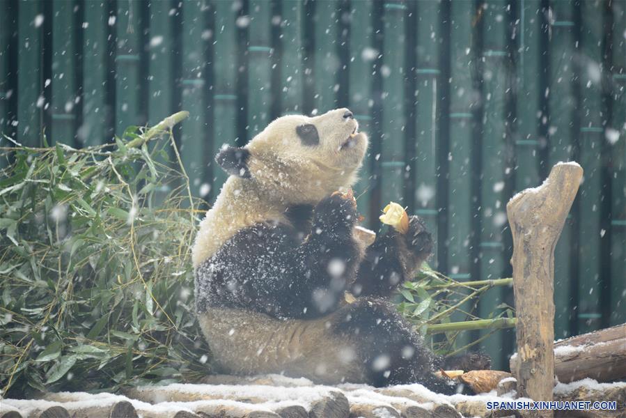 BEIJING, febrero 12, 2019 (Xinhua) -- Un panda gigante se alimenta con brotes de bambú bajo una nevada en el Zoológico de Beijing, en Beijing, capital de China, el 12 de febrero de 2019. Una nevada afectó el martes a Beijing. (Xinhua/Fan Jiashan)