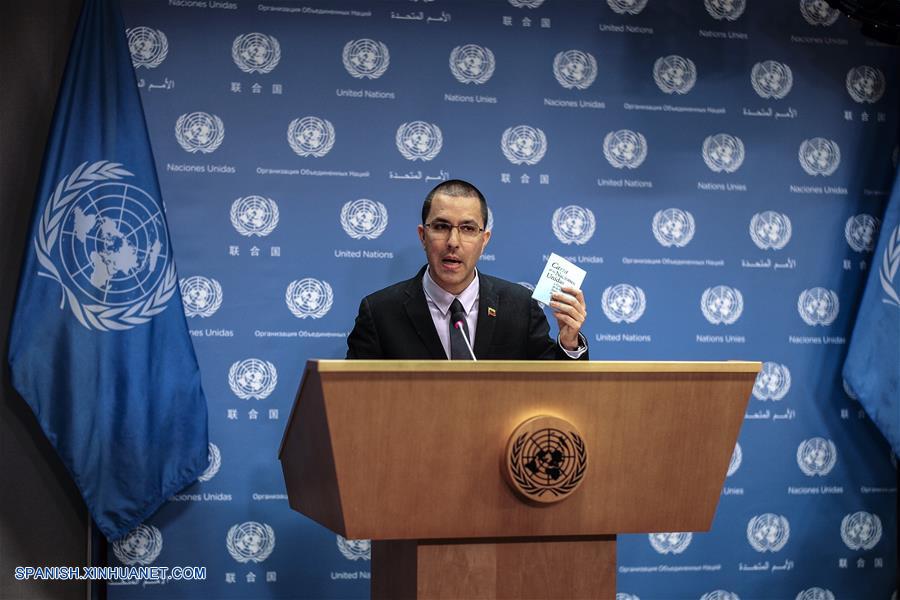 NUEVA YORK, febrero 12, 2019 (Xinhua) -- El ministro de Relaciones Exteriores de Venezuela, Jorge Arreaza, participa durante una conferencia de prensa en la sede de la Organización de las Naciones Unidas (ONU), en Nueva York, Estados Unidos, el 12 de febrero de 2019. El ministro de Relaciones Exteriores de Venezuela, Jorge Arreaza, dijo el martes que el gobierno encabezado por el presidente Nicolás Maduro está listo para sentarse con la oposición sin condiciones y buscar una solución a la crisis política. (Xinhua/Li Muzi)