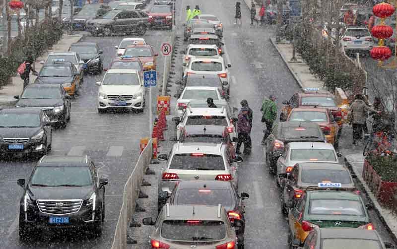 El tráfico circula lentamente bajo la nevada en Beijing el 12 de febrero de 2019. [Foto de Feng Yongbin para chinadaily.com.cn]