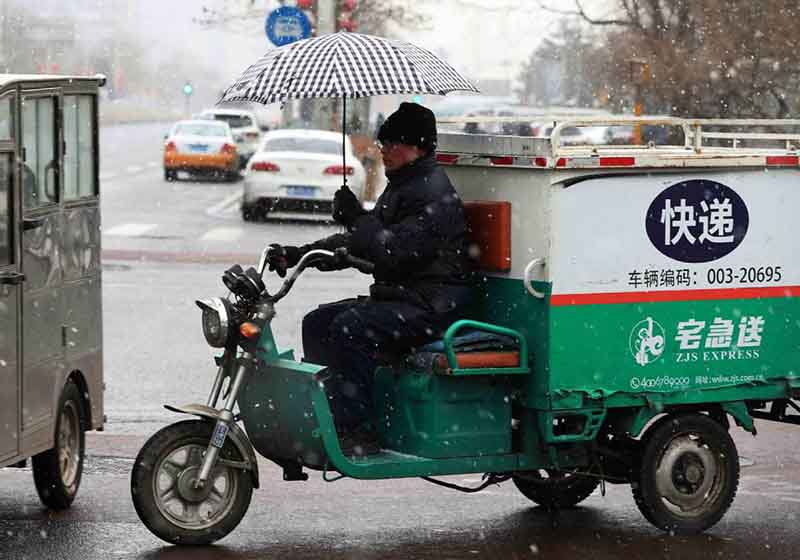 Un repartidor de correo exprés conduce su vehículo bajo la nevada en Beijing el 12 de febrero de 2019. [Foto de Feng Yongbin para chinadaily.com.cn]
