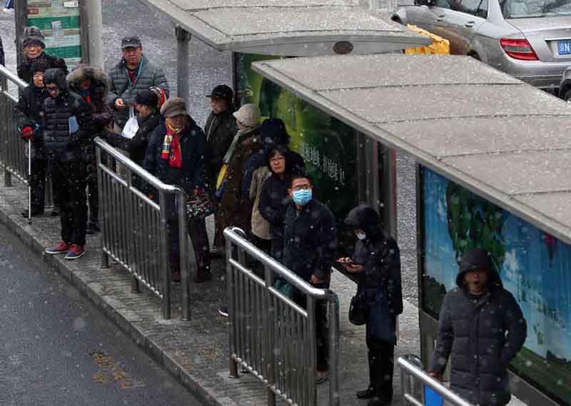 La gente espera a los autobuses bajo la nevada en Beijing el 12 de febrero de 2019. [Foto de Feng Yongbin para chinadaily.com.cn]