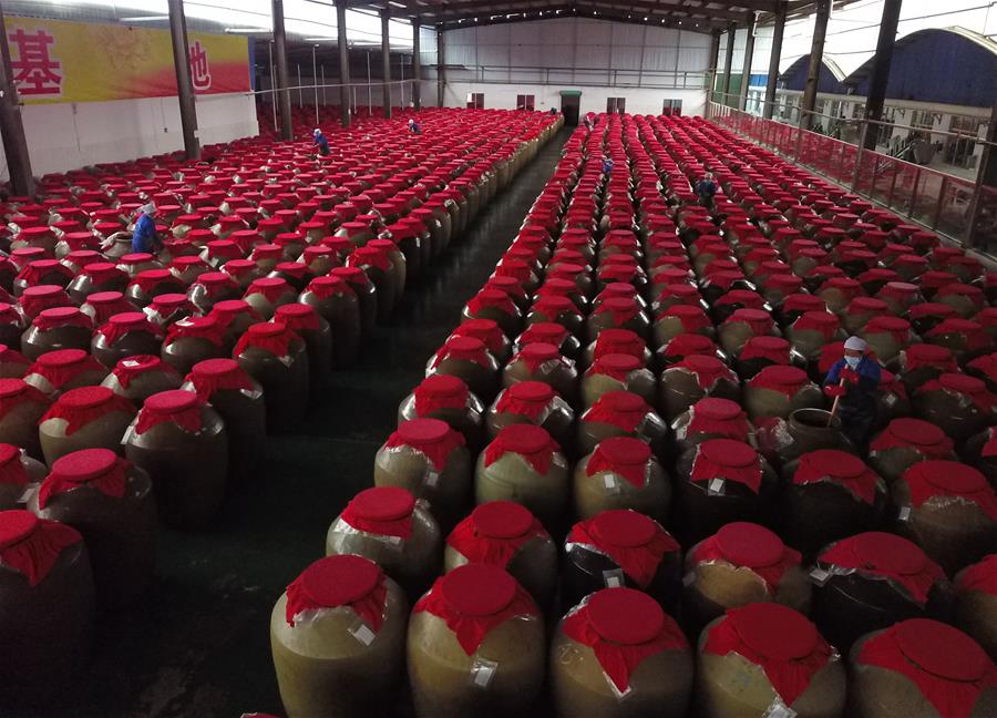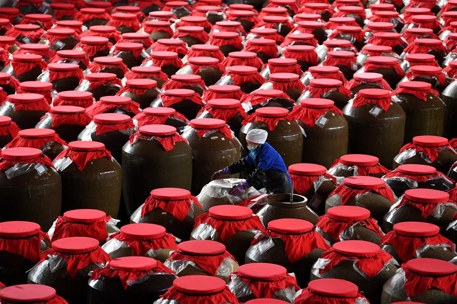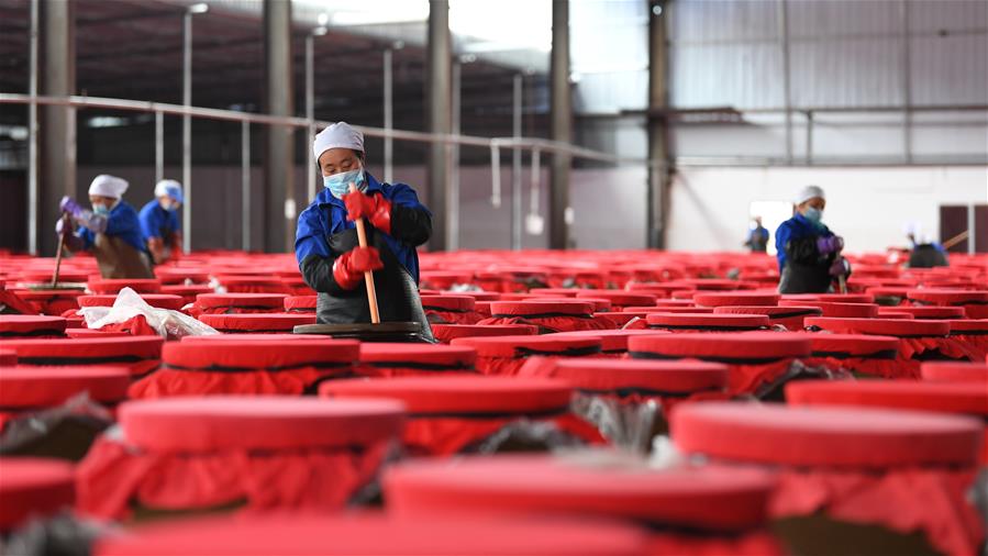 GUIZHOU, febrero 13, 2019 (Xinhua) -- Una trabajadora revisa la sopa agria roja en fermentación en una planta de procesamiento de alimentos, en el condado de Majiang, provincia de Guizhou, en el suroeste de China, el 13 de febrero de 2019. La sopa agria roja, una sopa tradicional en la Prefectura Autónoma Miao y Dong de Qiandongnan, es hecha a base de chiles frescos, tomates y jengibre. (Xinhua/Cai Xingwen)