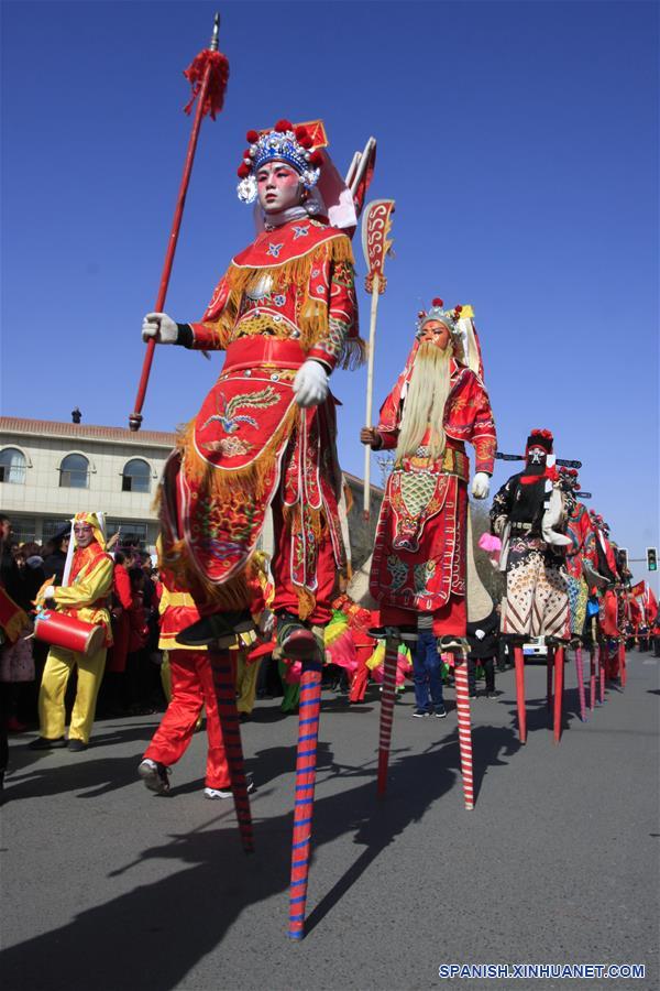 GANSU, febrero 13, 2019 (Xinhua) -- Imagen del 12 de febrero de 2019 de ejecutantes caminando sobre zancos durante el shehuo, una festividad artística folclórica practicada durante la Fiesta de Primavera, en el distrito de Liangzhou en Wuwei, provincia de Gansu, en el noroeste de China. (Xinhua/Jiang Aiping)