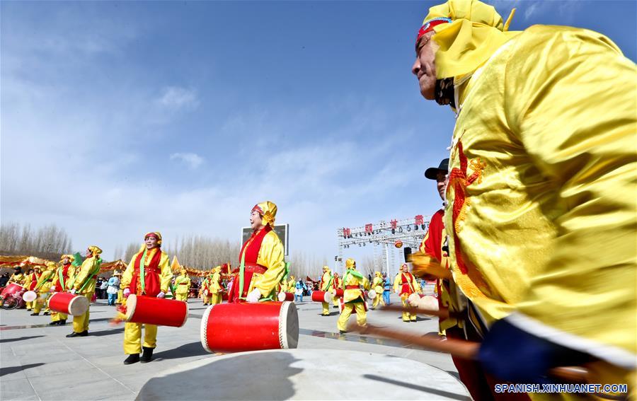 GANSU, febrero 13, 2019 (Xinhua) -- Ejecutantes presentan una danza de tambor durante el shehuo, una festividad artística folclórica practicada durante la Fiesta de Primavera, en la localidad de Xindun del distrito de Ganzhou en Zhangye, provincia de Gansu, en el noroeste de China, el 13 de febrero de 2019. (Xinhua/Wang Jiang)
