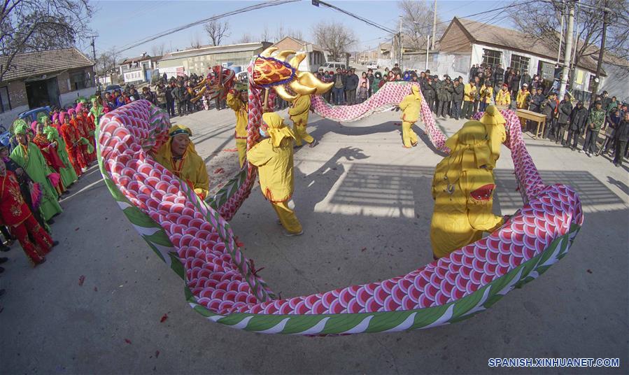 GANSU, febrero 13, 2019 (Xinhua) -- Ejecutantes presentan la danza del dragón durante el shehuo, una festividad artística folclórica practicada durante la Fiesta de Primavera, en la localidad de Xindun del distrito de Ganzhou en Zhangye, provincia de Gansu, en el noroeste de China, el 13 de febrero de 2019. (Xinhua/Wang Jiang)