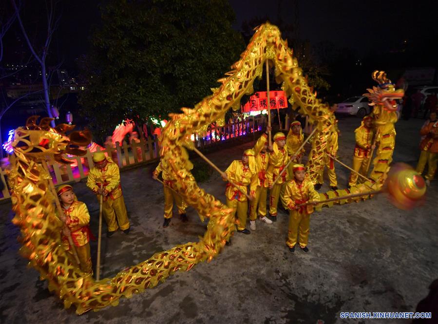 HEBEI, febrero 13, 2019 (Xinhua) -- Ejecutantes presentan la danza del dragón, en el distrito de Fengrun de la ciudad de Tangshan, provincia de Hebei, en el norte de China, el 13 de febrero de 2019. (Xinhua/Liu Mancang)